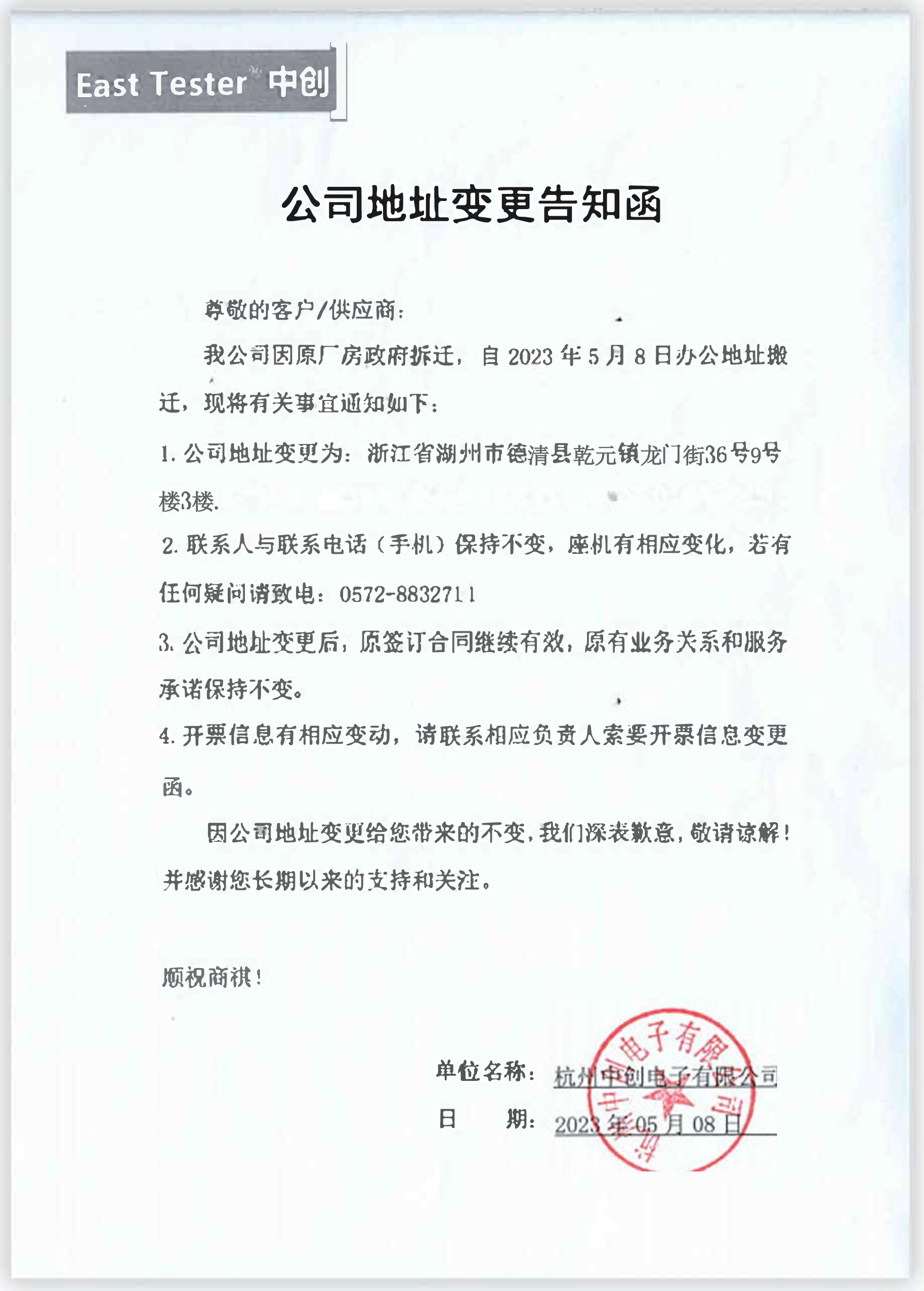 杭州中创-企业生产地址变更通知