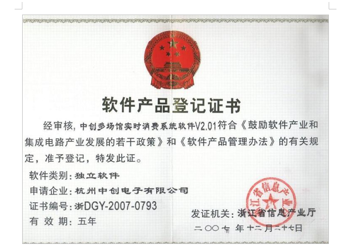 杭州中创电子有限公司被授予软件产品登记证书